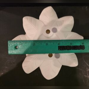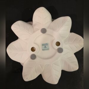 The Vintage PartyLite Bisque Magnolia Lotus Blossom Pillar Candle Holder Model P7369 is approximately 5 5", a asymmetrical candle holder made of bisque style porcelain. It features a classical style with a matte finish, showcasing a beautiful flower pattern in white and a gold tone beaded rim around the candle well. This candle holder, debuted in 1999 by PartyLite, is suitable for pillar or tealight candles and is perfect for lighting up the house with its romantic theme and original design that make it a charming addition to any decor, adding a touch of elegance to any occasion. In excellent pre-owned condition
