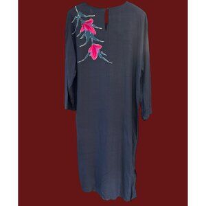 This dress from Passports by Pier 1 Imports presents a striking floral design on a black background. Crafted from rayon, it offers a comfortable and stylish fit. Ideal for various occasions, its long sleeves and vibrant pattern add a touch of elegance.