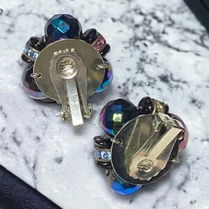 Vintage Pastel AB Crystal Rhinestone Black Bead Cluster Clip On Earrings