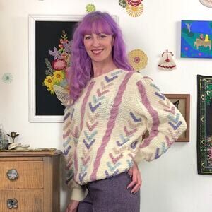Beautiful vintage sweater combines a fishermans style with an English Country Garden. Thick wool yarn in creamy off-white is embellished with dusty pastel details. Rose cableknit stripes, and oversized chevrons in purple, sky blue, rose, and taupe. Absolutely lovely, cozy for fall and winter.