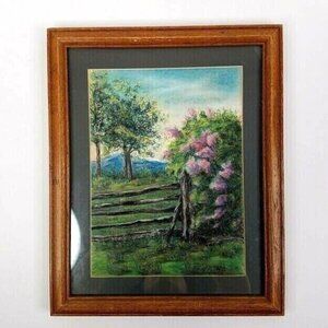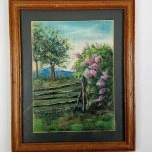 Vintage Pastel Chalk Drawing Lana Kariker Scenic Landscape Lilacs Wooden Fence