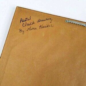 This vintage framed artwork by Lana Kariker captures a serene landscape with vibrant lilacs and a rustic wooden fence. The use of pastel chalk imbues the scene with a soft, calming atmosphere, highlighting nature's beauty. It's housed in a wooden frame, adding a touch of elegance, making it suitable for art enthusiasts and collectors.