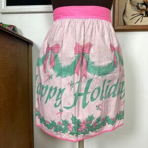 Super pretty and fun little half apron feels like cotton and has such a unique pastel holiday vibe.  Pink and white stripe apron is bound in neon pink trim and waistband. The print features evergreen swag with pink bows, the words "Happy Holidays!" in green, and there is holly printed along the bottom.  Tiny little candy canes and pink snowflakes also intersperse around the words.