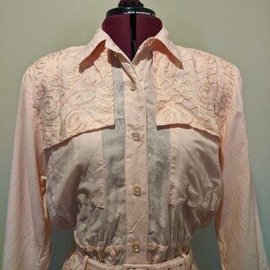 Step into timeless elegance with this beautiful vintage pastel pink dress. Featuring delicate embroidery on the bodice and waist, this full-length, flowy piece captures a soft, romantic charm. The structured silhouette is balanced with graceful detailing, making it a lovely choice for vintage lovers or special occasions.