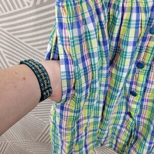 Vintage Pastel Plaid Dress Size Large flare Pleated Button Front Blue Yellow