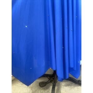 Solid blue. Slightly puff shoulders with medium weight shoulder pads. Long shoulders. Handkerchief skirt. Full skirt. V back. Round neck. Pearl and rhinestones sewn on the sleeves and bodice. Zipper side with buttons atop the zipper. Fully lined.