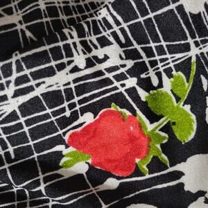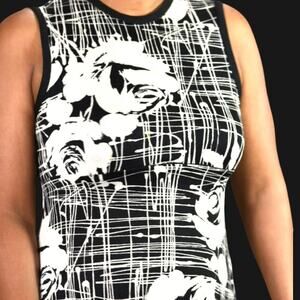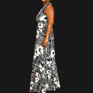 Vintage 70s Pat Richards maxi dress FEATURES abstract floral splatter pattern in black in white with a few red flowers. Crewneck. Sleeveless. Long length. Slinky Stretch fabric. Zipper back closure.