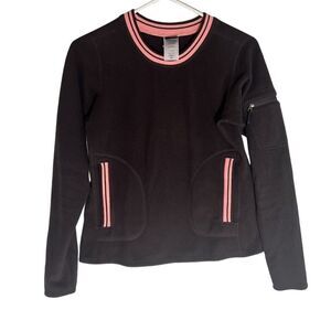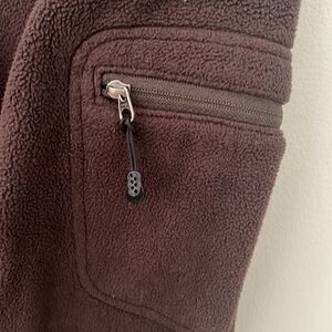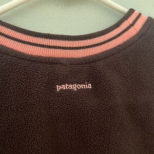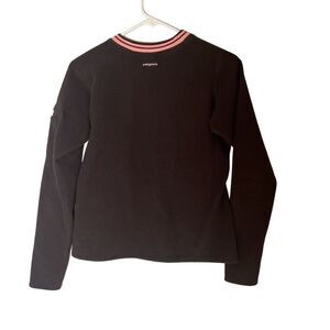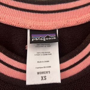 Patagonia Women's Rhythm Plush Synchilla® Fleece Crewneck Pullover in chocolate brown. Vintage 2006 fleece pullover with a striped pink and brown trim accenting the collar and front slash pockets. Zippered pocket on the left arm. Excellent condition without flaws. Style No. 20880