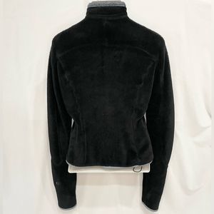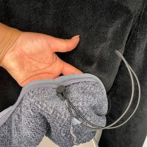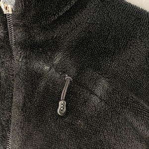 Very warm sweater in good used condition. This is vintage. This style comes with longer sleeves. They look fine when wearing the sweater. Comes with a drawstring to tighten on the waist area. Please note that the left upper chest area has two small “stains” or areas that seems to have less fleece. Not quite sure how to describe it.