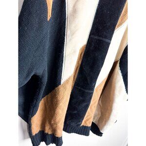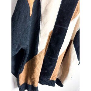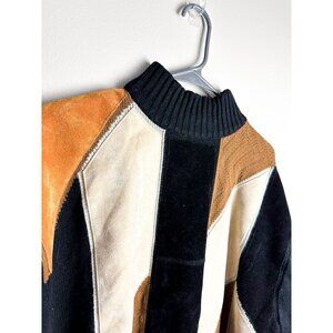 Vintage Patchwork Faux Suede Mock Neck Grandapa Sweater Black Cream Large
