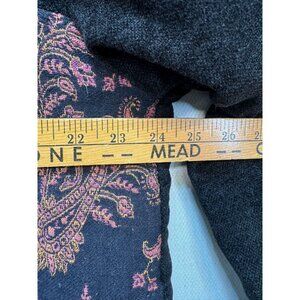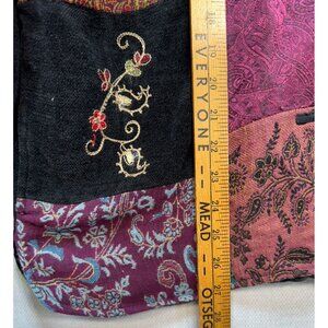 This vintage patchwork jacket features intricate floral embroidery and toggle closures, offering a blend of artistic design and practicality. Crafted with a mix of rich colors and patterns, it provides a unique and stylish appearance suitable for various settings. Faux velvet backing.