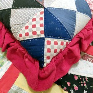 Vintage Patchwork Ruffle Pillow Bright Red Groovy Prints Flowers Stars Check BOH