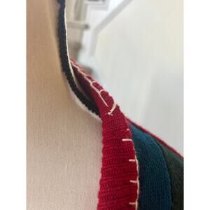 Adorable vintage piece. Red with blue and green patchwork. Multiple snowmen, trees and candy canes. Beaded tassel pull. Sleeveless zip up vest.