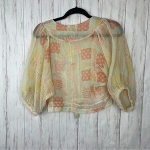 Vintage Patchwork Xtrovert blouse in pale yellow and tangerine. No size but would best fit a small to medium. Please refer to measurements below. Cute fall style with patchwork detailing! Reminds me of free people.