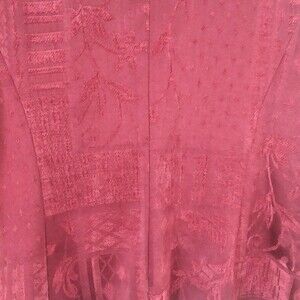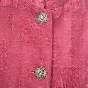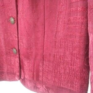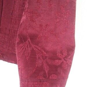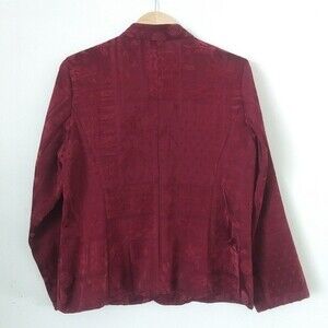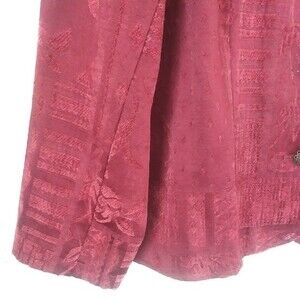 Vintage 90s lightweight jacket/blazer in a maroon/burgundy color. Fabric is a velvety jacquard with a patchwork floral and geometric motifs. Stand up collar, ornate filigree metal buttons, full length sleeve. Fabric is 50% rayon, 32% polyester, 18% cotton. Dressbarn brand, tag size large, measures 21" pit to pit and 25.5" long. Very good used condition - no flaws or visible wear.