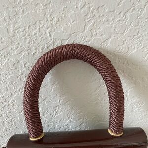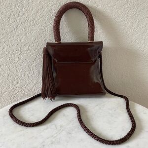 Description: This vintage handbag makes a bold statement with its deep brown patent leather, offering a high-gloss finish that catches the light with every movement. The uniquely shaped flap closure and braided handle add sculptural intrigue, while the matching braided shoulder strap and tassel detail evoke a sense of bohemian elegance. A striking blend of polish and personality, it’s perfect for elevating both everyday looks and evening ensembles.