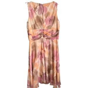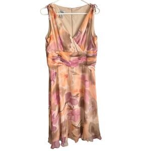 Channel timeless elegance with this beautiful vintage Patra dress, size 12. Crafted from lightweight chiffon with a soft, romantic floral print in peach, blush, and lavender tones, this dress features a flattering V-neckline, ruched waist, and flowy A-line skirt that drapes gracefully. The sleeveless design with delicate shoulder ties adds a touch of feminine charm, making it perfect for weddings, garden parties, or any special occasion. Fully lined for comfort and modesty.