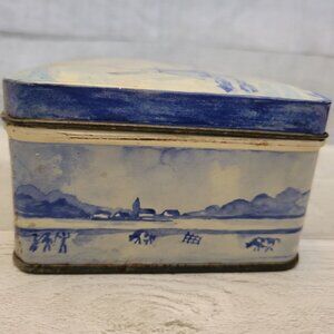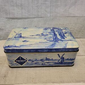 Vintage Patria Windmill Design Metal Tin Box 1970s Dutch Blue & White