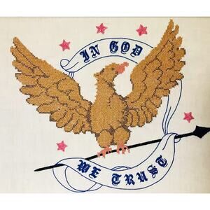 This vintage cross-stitch piece features an eagle, arrow and stars design with a banner that reads “In God We Trust” with a patriotic color scheme. The artwork is matted and framed, measuring 22.5" x 19". The needlework itself measures approximately 16.75” x 13.5”. The frame is made of wood, the matting of fiberboard, and the artwork of cotton, and was created in the United States, most likely during the 1970s. It was professionally framed. The piece has a folk art look and would make a great addition to any collection.