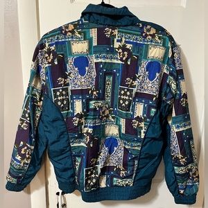 Zipper closure, snap buttons at top and bottom, cinch drawstring around neck, open pockets.