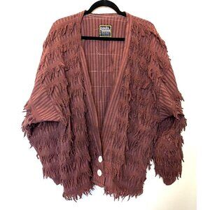This vintage 1980's Paula Sweet Muslin Minx jacket offers a unique, oversized fit with a distinct fringe design. Made from 100% cotton, it features a stylish double button closure and a warm rust brown color that adds an element of rustic charm. Ideal for those seeking a one-of-a-kind, cottagecore-inspired piece. Taffeta rag.