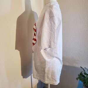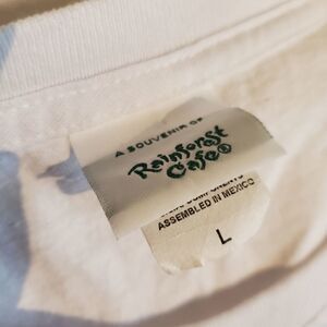 Vintage. Rainforest Cafe. 100% Cotton Novelty Tee. Peace Sign graphic with American Patriotic Print Theme. Crewneck. Short sleeve. Size Large.