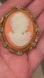 Elegant vintage peach and cream cameo brooch featuring a cream silhouette on a peach background. Accented with gold trim and sparkling stones.