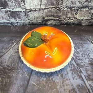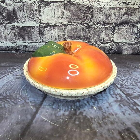 Add a touch of vintage charm to your kitchen with this delightful peach pie holder! This ceramic pie plate with a lid is perfect for keeping your homemade pies fresh and delicious. The warm peach color and classic design will make it a lovely addition to your table setting or a thoughtful gift for the baker in your life.