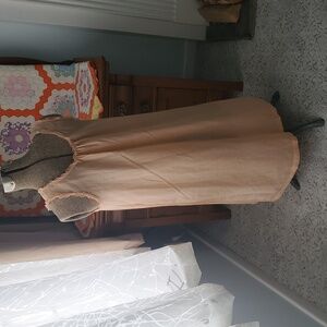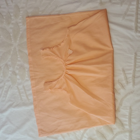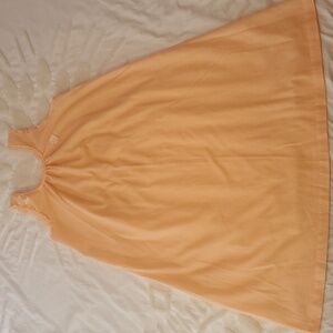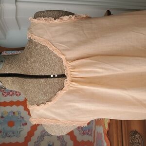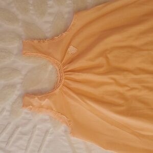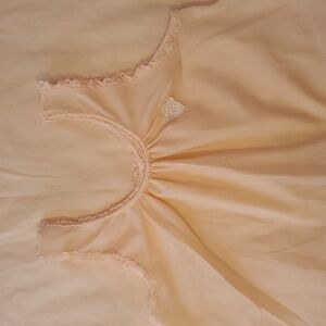 Valentine's Day Drop! Experience comfort and elegance with this peach sleeveless nightgown. Perfect for you or your Valentine to be comfortable and sexy sweet! Lace trim around neck and arm holes. Floral applique on left chest. Small seam repair pointed to by right front armpit (hidden under lace) and faint white line pointed to in photo. No brand label. Tag say 65 poly/ 35 cotton blend.