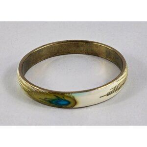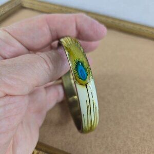 Vintage Peacock Bangel 3" x 3/8" Brass Enamel Bracelet Boho Feathers