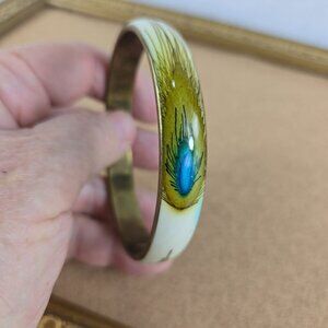 Unique vintage "peacock feather" bangle bracelet. Enamel with feather in-set on a brass band. Good condition, showing modest aging patina on brass.