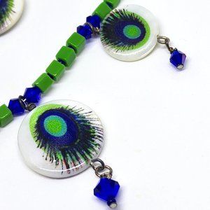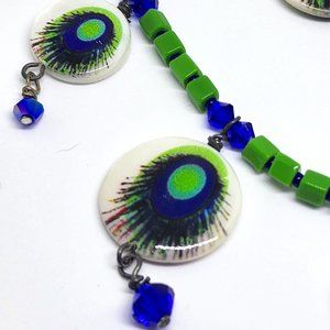 Tags: vintage, handmade, hand made, one of a kind, unique, art, art glass, green, blue, peacock, feathers, beaded, necklace, earrings, dangle, drop, statement, runway, talking pieces, mother of pearl, abalone, glass