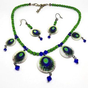 Vintage Peacock Blue Green MOP Handmade One-of-a-Kind Necklace Earrings Set