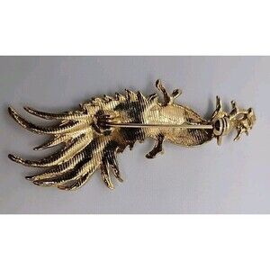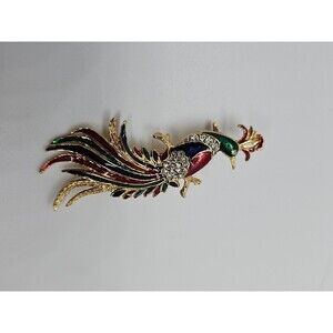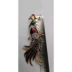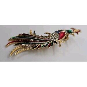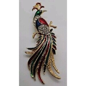 Vintage Peacock Brooch Pin Enamel on Metal Crystals Gold Tone Setting 2.5" Long