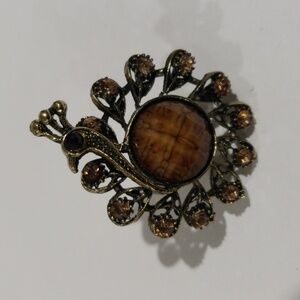 Add regal charm to your collection with this vintage-inspired peacock ring. Featuring a bold, cracked brown center stone surrounded by shimmering Brown gems, this antique gold-tone adjustable ring combines elegance and artistic flair. Perfect for statement wear, gifting, or for those who love peacocks. NWOT