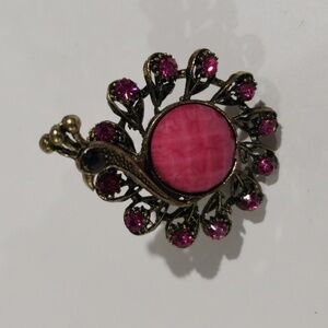 Add regal charm to your collection with this vintage-inspired peacock ring. Featuring a bold cracked pink center stone surrounded by shimmering fuchsia gems, this antique gold-tone adjustable ring combines elegance and artistic flair. Perfect for statement wear, gifting, or for those who love peacocks. NWOT