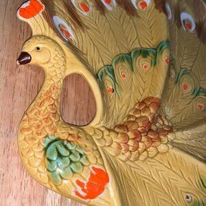 This intricately designed vintage ceramic peacock platter captures attention with its rich detailing and vibrant hues. Ideal for both decorative and functional use, the platter's unique peacock shape adds a touch of elegance to any setting. A distinctive piece for collectors or those looking to elevate their dining aesthetics.