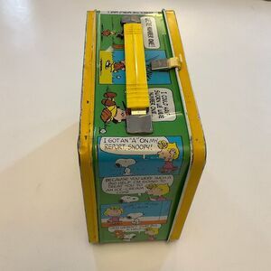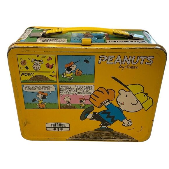 Vintage metal Peanuts baseball themed lunchbox from the 70s charlie Brown, Lucy ,Snoopy. Wear at edges, some dings. Plastic clil closure and handle. Overall really good condition. Inside is very clean. #vintagelunchbox #snoopy 70s #genx