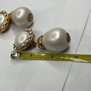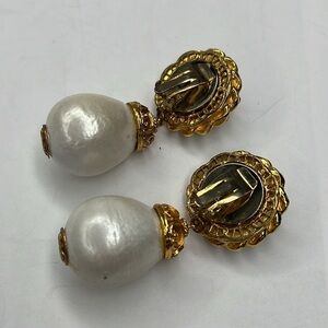 This is a Vintage Pear like Material Drop Clip Earrings. Some scuffs and minor pin spots with two tiny white stones missing. Overall unseen and in very good vintage condition