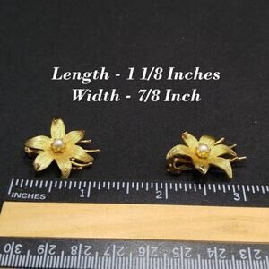 The center of each earring is a pearl. The earrings are 1 1/8 inches in length and 7/8 inch wide. The gold plating is in great condition and the pearls look great. You can see a little glue at the base of each under magnification.