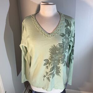 Beautiful Vintage Pearl decorated mint green sweater. Long sleeve, v neck, straight cut. 100% acrylic. Floral pattern detailed with pearls up front and down left arm. EVC. No tears rips or stains. No loose pearls. So soft. Size on tag is illegible due to age, but seems like a large. Measurements provided - 26” L, 22” P-P.