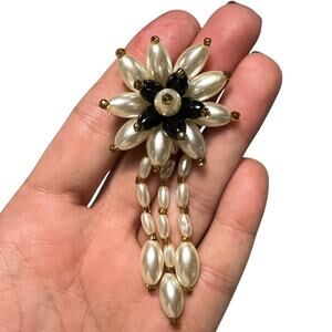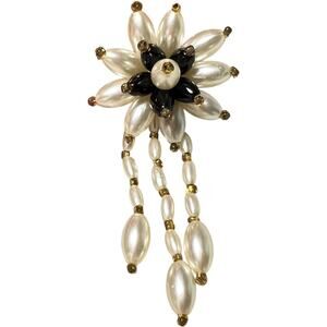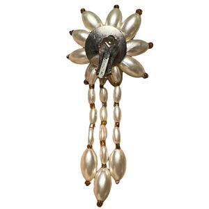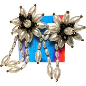 Vintage Pearl Flower Clip On Earrings Black White Dangling Statement