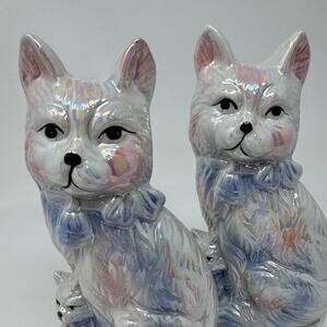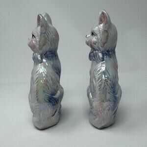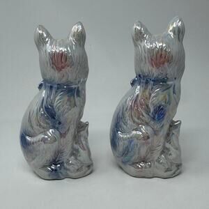 Vintage Pearl Lustreware Porcelain Pink & Blue Cat with Kitten Statue Set of 2