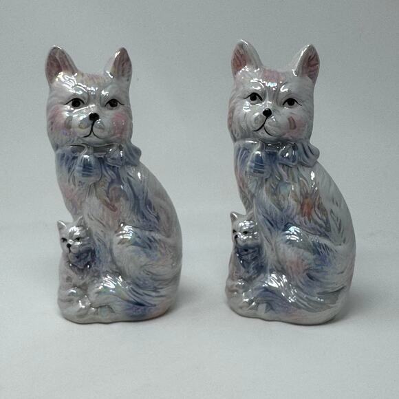 Vintage Pearl Lustreware Porcelain Pink & Blue Cat with Kitten Statue Set of 2