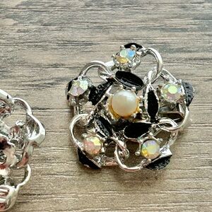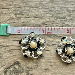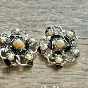 Add timeless sparkle to your collection with these beautiful vintage clip-on earrings. Featuring luminous faux pearls at the center, surrounded by iridescent rhinestones and silver-tone filigree with black enamel accents, these earrings offer an elegant floral-inspired design. Perfect for special occasions, weddings, or adding a touch of vintage charm to everyday looks.