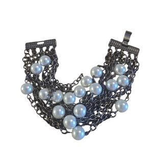 Vintage pearl and metal multi-chain comprised of 10 cable chains with pearl stones interweaved throughout. It measures approximately 7" L X 3" W.