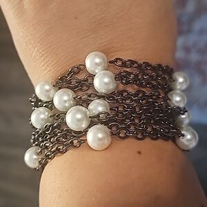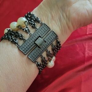 Vintage Pearl Stone And Multi-Chain Gunmetal Bracelet with a foldover clasp