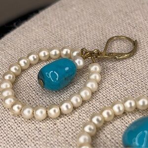 Vintage Pearl Turquoise Hoop Earrings Retro Boho Dangle Style Teal Ivory