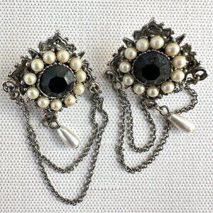 These vintage 1960s Victorian Revival pierced earrings feature ornate silver-tone settings with faceted black glass centers surrounded by faux pearls. Draped chains and teardrop pearl drops add dramatic movement, making these earrings a striking statement piece of mid-century costume jewelry.