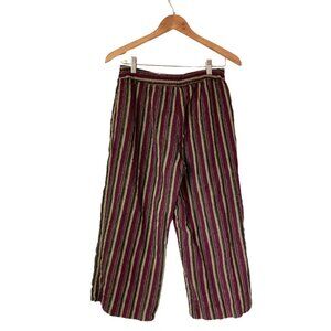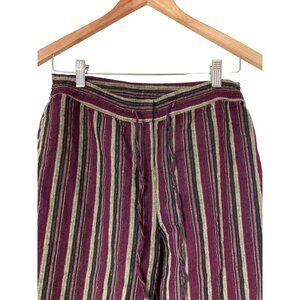 Add a pop of vintage charm to your wardrobe with these eye-catching Peck & Peck striped linen capri pants. Featuring a vibrant blend of purple, gold, and green stripes, these lightweight pants offer both comfort and style. Made from breathable linen, they're perfect for warm weather or a bold layered look.
